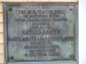 In addition to frightening Hamilton’s horse, the falls at Pawtucket have a special place in the history of the early American Republic. Slater Mill, built in 1790 and visible from the bridge, was the first successful textile factory in the United States and is considered the birthplace of the Industrial Revolution in America. The importance of mills and factories in early America cannot be underestimated. The rise of industrial mill towns and factory towns in the northeast Untied States in the first half of the nineteenth century was directly responsible for the massive increase in immigration and the dramatic rise in wealth that created what is now the largest economy in the world by a wide margin (US GDP in 2010 according to The Economist Intelligence Unit is $14.8 trillion, a quarter of the entire world GDP, while the the next three largest economies of China, Japan, and Germany combined do not quite equal that of the United States). The location here at Pawtucket Falls was chosen to take advantage of the force of falling water to power machinery to spin cotton fabric. The success here at Pawtucket initiated a flood of mill construction along rivers all around New England, including those located at Lowell, Lawrence, and Manchester New Hampshire and the success of these mills resulted in the rapid growth of the principal ports which handled the shipment of much of the production of the mills, Boston and Providence.