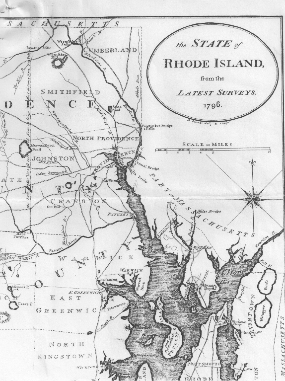 Part of a map of Rhode Island by B. Tanner, 1796. This map shows all of the area east of the Pawtucket and Seekonk Rivers as Part of Massachusetts. Today these areas comprise Pawtucket and East Providence, Rhode Island. Formerly known as Rehoboth or Seaconck, this area was the more popular route from Boston as it passed more directly to Bristol and Newport to the south. Pawtucket Bridge and Falls are shown at top center, as is the road I followed into Providence, the southwesterly road through North Providence. Note that Providence even in 1796 still is comprised of only three or four main streets, today’s Main, Benefit, and Weybosset Street. Also note the two bridges to the southeast of Providence, Central and India Bridges. These were the original Lower and Upper Providence Ferry crossings. Hamilton detoured to Providence by crossing Pawtucket Bridge then recrossing the river at India Bridge (Providence Ferry in 1744) then continuing on to Newport.