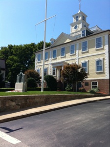 Above left is a photograph of East Greenwich Town Hall, formerly the Kent County Courthouse, built in 1804. Above right is a view from the East Greenwich Library down the hill to Main Street. The town rises steeply from Greenwich Harbor.