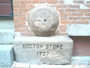 Even this part of the story of the Post Road is muddled. For many years a myth has existed concerning a certain stone in the Blackstone Block, on the way to the North End of Boston, about a quarter mile from The Old State House. This stone, embedded in a wall of a building on Marshall Street, is often referred to as the Boston Stone or the zero milestone and is often mistaken for the starting point from which distances from Boston are measured. In fact, it is not, nor has it ever been used for that purpose. George Weston, in Boston Ways believes it to be a grinding stone for paint brought from England in 1700, which was later placed there by the owner of the establishment (1). Charles Bahne, in The Complete Guide to the Freedom Trail, states that “the stone was forgotten until a tavern owner found it on his property. He named it the Boston Stone, and set it in front of his tavern as an advertisement. It has been there ever since”(2). The present origin point of the distances one sees on signs indicating the distance from Boston for instance on I-95) is the State House on Beacon Hill (the “New” State House, built by Bulfinch in 1797). In Colonial Boston, the starting point for all distances measured to and from Boston was the Town House, at the intersection of State (formerly Great, then King) Street and Washington (formerly Cornhill, Marlborough, Newbury, and Orange Streets) Street, which was and remains the heart of Boston.