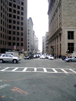 Below: View down State Street from Old State House. Long Wharf and Boston Harbor are just beyond the last office towers.